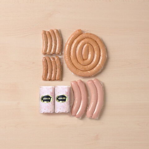 【数量・内容】屋久島茶葉入りウィンナー100g×2、ボロニア180g×2、羊腸フランク120g×2、ぐるぐるウィンナー400g(約80cm)×1