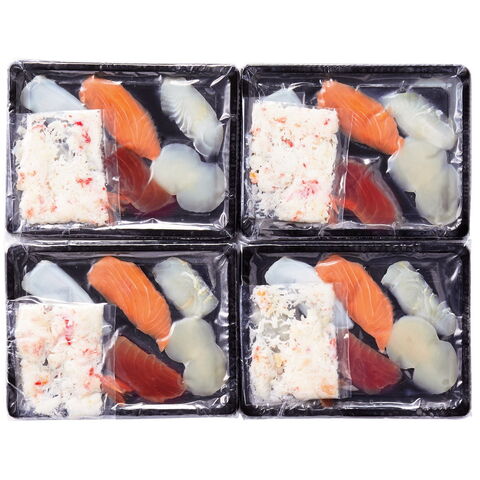 【数量・内容】海鮮丼の具(ほたて貝柱、赤いかスライス、トラウトサーモン、ひらめ、赤えび、キハダマグロ×各1切)×4、ボイルずわいがにほぐし身20g×4