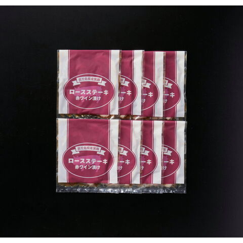 「黒豚赤ワイン漬ステーキ用」 甘く柔らかい鹿児島県産黒豚ロースを赤ワイン入りの自家製味噌醤油たれに漬け込んでいます。フライパンで焼くだけでお召し上がりいただけます。
