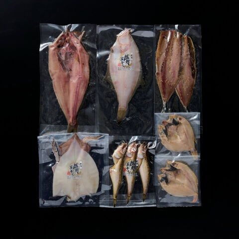 【数量・内容】開きほっけ200g、干し赤がれい170g、開きのどぐろ55g×2、干しはたはた100g(計3~4尾)、開きいか70g、さんま味醂干し150g(計2尾)