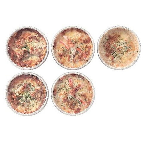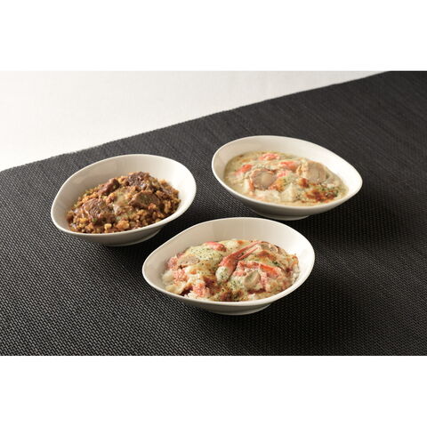 【数量・内容】境港産紅ズワイガニのバターライスドリア280g×2、境港産紅ズワイガニと北海道産帆立のクリーミーグラタン250g、焼きチーズビーフカレー250g×2