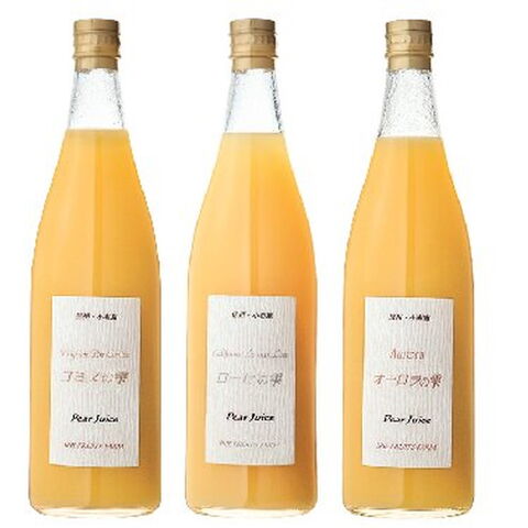 「洋梨ジュース詰合せ(720ml×3)」 ※しっかり追熟の進んだ「オーロラ」、栽培が難しいため希少な「コミス」と「ラヴィアンローゼ」、3種類の西洋梨100%のジュースです。濃厚な甘みと芳潤な香りをご堪能ください。