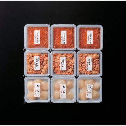 【数量・内容】いくら醤油漬け 50g×3、花咲がにむき身 70g×3、帆立貝柱 80g×3