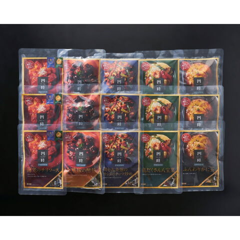 【数量・内容】海老のチリソース・金華豚の酢豚・鶏と九条葱のカシューナッツ炒め各150g×各3、具だくさん八宝菜170g・ふんわりかに玉185g×各3
