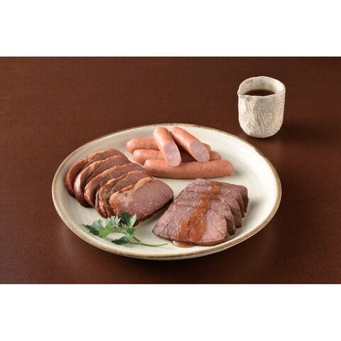 【数量・内容】特選ロースハム320g、ローストビーフ200g、ローストビーフソース40g、特選肩ロース180g、やわらか焼豚185g、生ハム45g、あらびき燻しウインナー80g、特選燻しポークハム180g