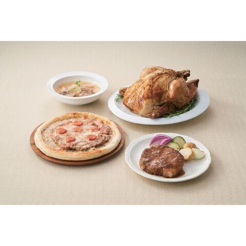 「ローストチキンとバラエティセット」 柔らかく焼き上げたローストチキンに、やさしい味わいの豚肩ロースのあっさりカスレとハンバーグ王子の3種のハンバーグピザ、お箸で切れるほどに柔らかい厚切りしょうが焼きをセットにしました。