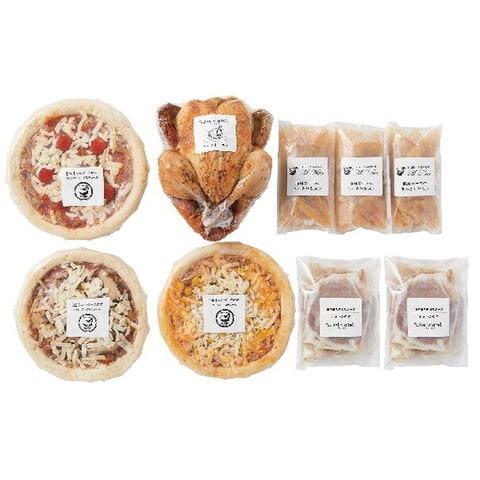 【数量・内容】ローストチキン1300g、豚肩ロースのあっさりカスレ200g×3、コーンオーロラソースのハンバーグピザ300g、プチトマトハーブ風味ソースのハンバーグピザ305g、きのこデミグラスソースのハンバーグピザ300g、ほろほろ厚切りポーク180g×2、しょうが焼きのたれ40g×2