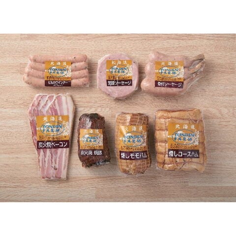 「北海道トンデンファーム詰合せ」 直下式炭火製法でじっくり燻煙して仕上げたハム・焼豚・ベーコン・ウィンナー類をバラエティーに詰合わせました。その風味、味わいをお楽しみください。