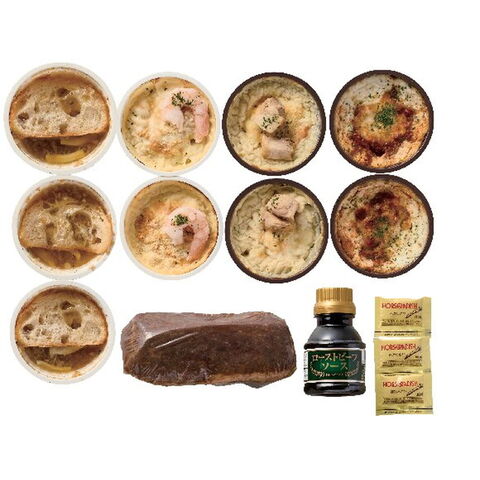 【数量・内容】エビとフジッリのグラタン・チキンとフジッリのグラタン各130g×2、ミートソースドリア145g×2、オニオングラタンスープ130g×3、ローストビーフ250g、ローストビーフソース・西洋わさび付