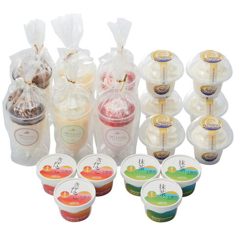 【数量・内容】十勝パフェ(ミルク&チョコ・メロンシャーベット・ストロベリー各200ml×2)、プレミアムソフトクリーム120ml×6、もちもちアイス(きなこ・抹茶各80g×3)
