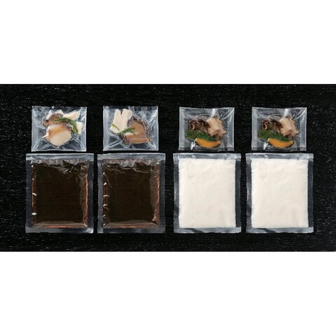 【数量・内容】あわびスープ(あわび10g(湯通し筍・みつば入)、出汁180g)×2、あわびクリーム煮スープ(あわび10g(ボイル南瓜・アスパラ入)、クリームスープ160g)×2