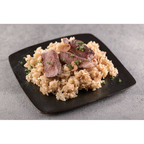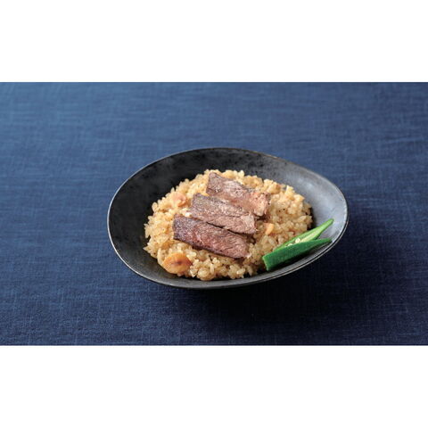 「土佐あか牛ステーキガーリックライス」 ガーリックの風味が効いたご飯の上に、あか牛のステーキを食べやすくカットしてのせています。電子レンジで温めるだけで簡単にお召し上がりいただける一品です。