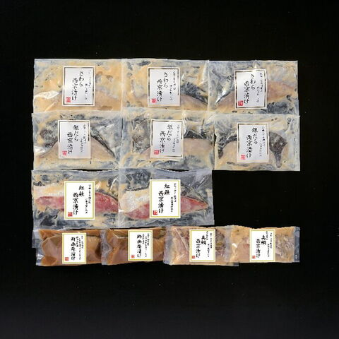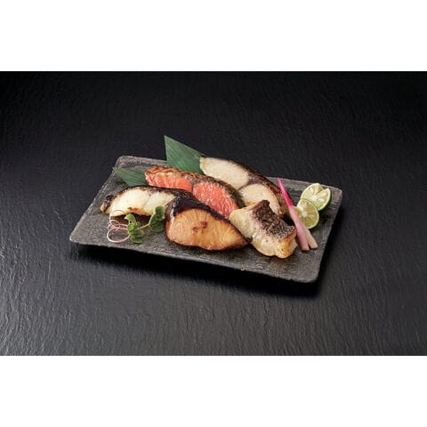【数量・内容】銀鱈西京漬70g×3、さわら西京漬70g×3、紅鮭西京漬70g×2、真鯛西京漬60g×2、ぶり幽庵漬70g×2
