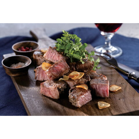 「黒毛和牛厚切りローストビーフステーキディナーセット」 黒毛和牛リブロースの見事な霜降りとしっとり感にこだわったローストビーフステーキです。肉質が柔らかく、しっとりしているので厚切りでもおいしくいただけます。