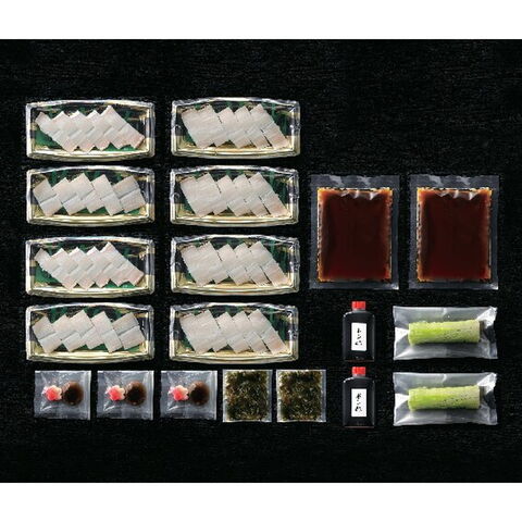 【数量・内容】鱧切身50g×8、ボイル白菜巻き(ほうれん草・人参入)×2、湯通しわかめ20g×2、生麩としいたけ×3、スープ250g×2、ポン酢80g×2