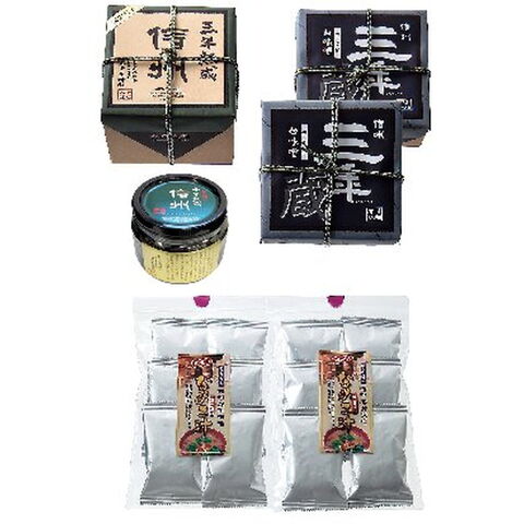 「石井味噌店 三年熟成味噌詰合せ」 杉桶で二寒二土用を過ごし、じっくり熟成させた味噌は、酵母や乳酸菌が生きた、芳潤でコクのある味わいです。忙しくてもおいしい味噌汁が飲みたいという方におすすめしたい、フリーズドライ味噌汁もセットにしました。
