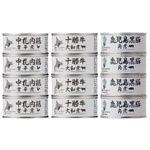 【数量・内容】十勝牛大和煮85g×4、鹿児島黒豚角煮・中札内鶏甘辛煮缶詰各80g×4