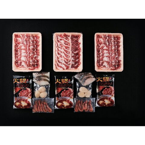 【数量・内容】ラムショルダー肉しゃぶしゃぶ用500g×3、甘海老60g・ほたて貝柱(3入)・鱈(3入)×各2、火鍋スープの素(2~3人前)150g×3