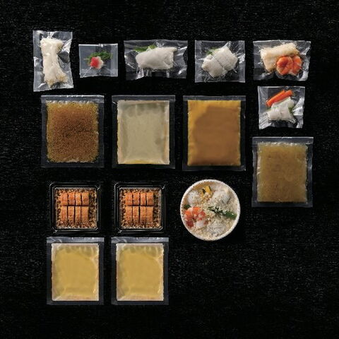 【数量・内容】鱧と生麩のみぞれ煮(鱧40g、梅麩・みつば、大根おろし入出汁135g)、鱧の吸い物(鱧40g(みつば入)、出汁140g)、鱧と鱧子の柳川鍋風(鱧40g(みつば入)、鱧子の柳川鍋風出汁(ごぼう入)150g)、鱧と海老のグラタン180g、鱧と海老の中華あんかけ(鱧と海老60g、湯通し野菜(小芋・筍・大根・みつば)20g、中華あん120g)、鱧のひつまぶし風ごはん(鱧ひつまぶし180g、〆出汁スープ150g)×2