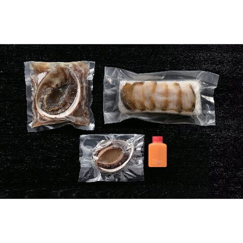 【数量・内容】あわびステーキ(あわび(殻付き)40g、ウニソース30g)、あわびバター蒸し(殻付き)180g、煮あわび棒寿司200g
