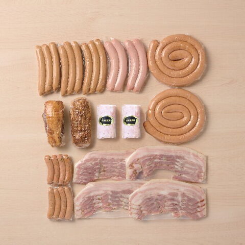 【数量・内容】無塩せきウィンナー120g×3、無塩せきバラベーコン90g×4、無塩せきバラチャーシュー250g×2、屋久島茶葉入りウィンナー100g×2、ボロニア180g×2、羊腸フランク120g×2、ぐるぐるウィンナー400g(約80cm)×2