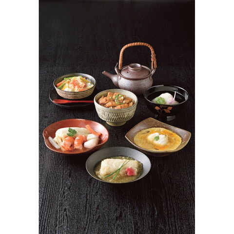 【数量・内容】鱧と生麩のみぞれ煮(鱧40g、梅麩・みつば、大根おろし入出汁135g)、鱧の吸い物(鱧40g(みつば入)、出汁140g)、鱧と鱧子の柳川鍋風(鱧40g(みつば入)、鱧子の柳川鍋風出汁(ごぼう入)150g)、鱧と海老のグラタン180g、鱧と海老の中華あんかけ(鱧と海老60g、湯通し野菜(小芋・筍・大根・みつば)20g、中華あん120g)、鱧のひつまぶし風ごはん(鱧ひつまぶし180g、〆出汁スープ150g)×4