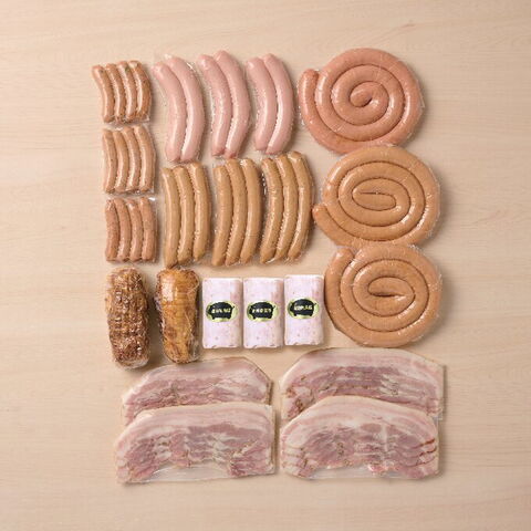 【数量・内容】無塩せきウィンナー120g×3、無塩せきバラベーコン90g×4、無塩せきバラチャーシュー250g×2、茶葉入りウィンナー100g×3、ボロニア180g×3、羊腸フランク120g×3、ぐるぐるウィンナー400g(約80cm)×3