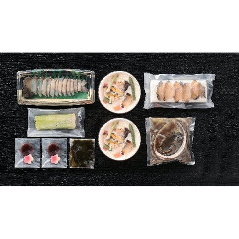 【数量・内容】あわびしゃぶしゃぶセット2人前(あわび50g、ボイル白菜巻き(ほうれん草・人参入)×1、湯通しわかめ20g、生麩としいたけ×2)、あわびグラタン150g×2、あわびバター蒸し(殻付き)180g、煮あわび棒寿司200g