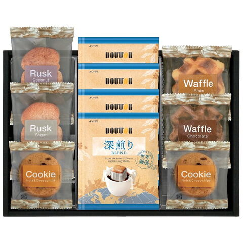 【数量・内容】ドトールドリップコーヒー7g×4、ラスク(シュガー・ココナッツ)・ワッフル(プレーン・チョコ)×各1、ナッツとチョコのざっくりクッキー×2
