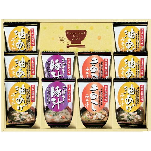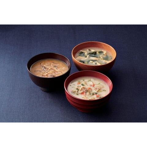 「フリーズドライ お味噌汁3種の味詰合せ」 和風だしを効かせた定番の味噌汁(油あげ)、米みそと豆みそをブレンドした風味豊かな味噌汁(きのこ)、コク深い味わいの豚汁。3種のお味噌汁の詰合わせです。