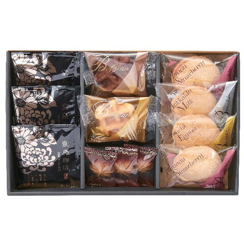 【数量・内容】堂島珈琲ドリップコーヒー×3、ブッセ(あまおう苺)×2、ブッセ(北海道ミルク・瀬戸内レモン)×各1、ベルギーワッフル(プレーン・ショコラ)×各1、コーヒークッキー×3