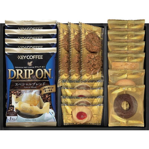 【数量・内容】キーコーヒードリップ8g×4、クッキー(プチラズリン×2、うずまき×2、トフィーアーモンド×4、プチコーヒー2枚入×3、リングバター×1、リングココア×1)
