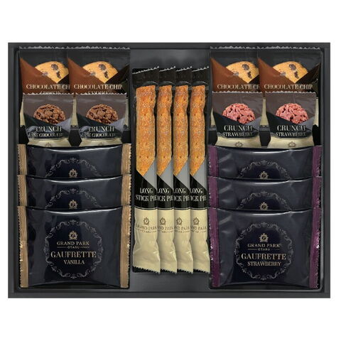 【数量・内容】ロングスティックパイ×4、ゴーフレット(バニラ・ストロベリー)×各3、チョコチップクッキー×4、チョコクランチ(ミルク・ストロベリー)×各2