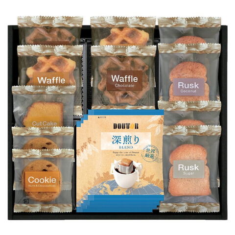 【数量・内容】ドトールドリップコーヒー7g×4、ラスク(シュガー・ココナッツ)×各2、ワッフル(プレーン・チョコ)×各2、ナッツとチョコのざっくりクッキー×2、レモンケーキ×1