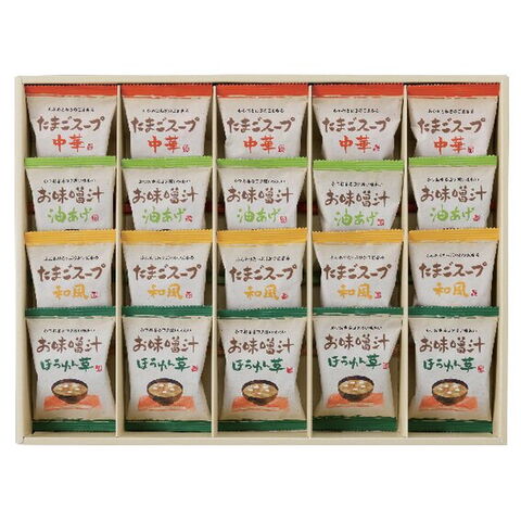 「フリーズドライ お味噌汁・スープ詰合せ」 「ほうれん草」、「油あげ」の2種のお味噌汁と、かつおが香る「和風」、ごまの風味と生姜を利かせた「中華」の2種のたまごスープを詰合わせました。