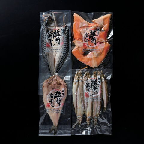 「おまかせ干物4種4点詰合せ」 脂がのった魚を干物にしました。時期に合わせて旬な魚を詰合わせてお届けします。