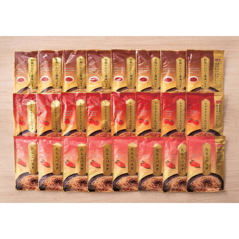 【数量・内容】和風にんにく醤油パスタ(麺100g、ソース30g)・トマトクリームパスタ(麺100g、ソース28g)・たらこパスタ(麺100g、ソース30g)×各8