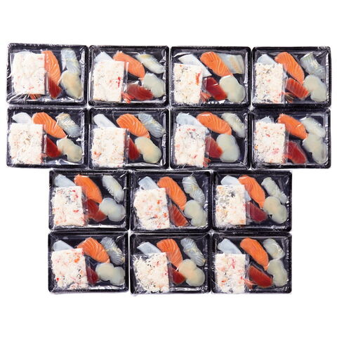 【数量・内容】海鮮丼の具(ほたて貝柱、赤いかスライス、トラウトサーモン、ひらめ、赤えび、キハダマグロ×各1切)×14、ボイルずわいがにほぐし身20g×14