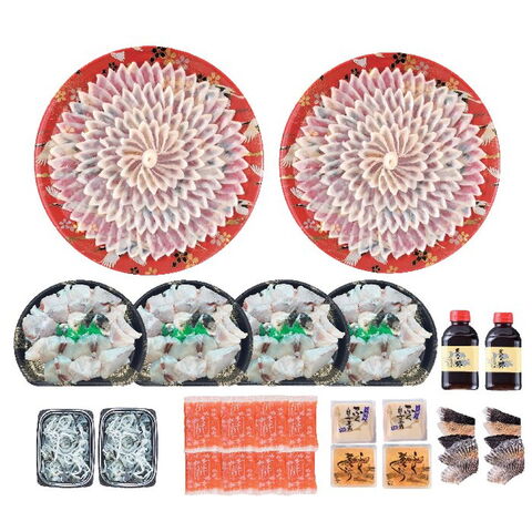 【数量・内容】天然とらふぐ刺身(33cm皿)160g×2、とらふぐ皮・ふぐ煮こごり各100g×2、とらふぐちり(切身、アラ)400g×4、ふぐ白子豆腐130g×2、ふくポン酢180ml×2、もみじおろし10g×8、とらふぐヒレ5枚×2
