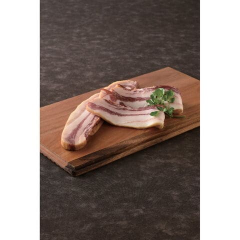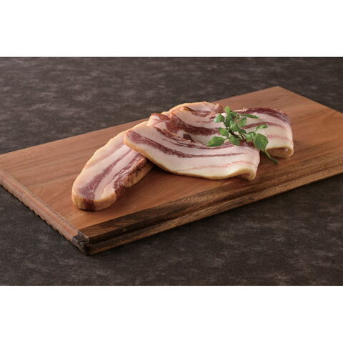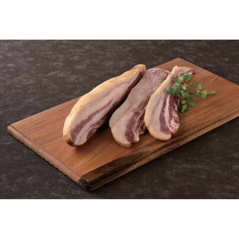「鹿児島県産黒豚パンチェッタ(生ベーコン)ブロック」 世界的に権威のある国際食肉コンテスト「IFFA」「SUFFA」のメダリスト工房で作った職人技のなせる味わいです。黒豚の生ベーコンをご体験あれ。