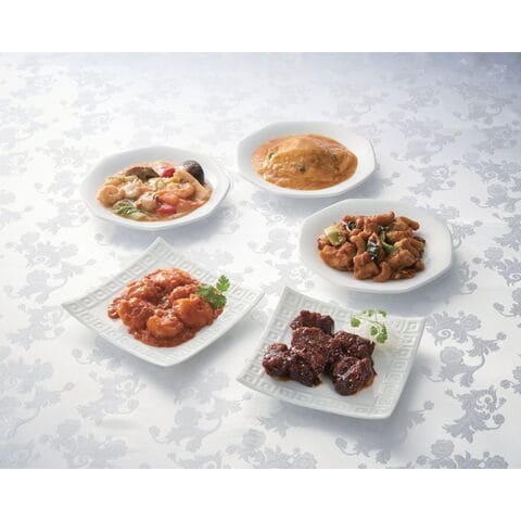 【数量・内容】海老のチリソース・酢豚・鶏と九条葱のカシューナッツ炒め各150g×各3、具だくさん八宝菜170g・ふんわりかに玉185g×各3