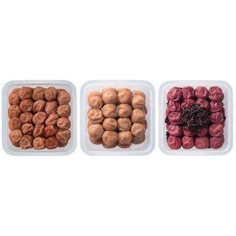 【数量・内容】はちみつ入梅干900g(2~4L粒)塩分約7%、まろやか梅900g(2~4L粒)塩分約10%、うす塩味しそ漬梅干900g(梅800g、しそ葉100g)2~3L粒、塩分約8%