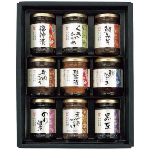【数量・内容】福神漬90g・くきわかめ75g・鯛みそ100g・鰹ひじき40g・鮭茶漬60g・牛肉ごぼう55g・のり佃煮95g・えのきだけ90g・黒豆100g各1瓶