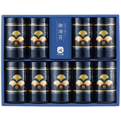 「やま磯 初摘み味付海苔セット YA9本詰」 やわらかく口どけのよい初摘み海苔だけを使用。有機丸大豆醤油を使用したたれで調味したコクと旨味のある味付海苔の詰合せです。食べたい量だけ取り出せ、保管も簡単、大変便利な卓上容器入りです。