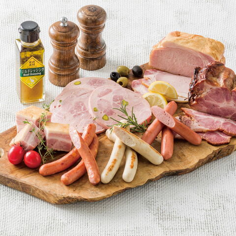 【数量・内容】ロースハム300g・焼豚300g・ビアシンケン200g・ベーコン300g・オリジナルウインナー4本・ブラートブルスト4本・ケーゼグリラー4本・オリジナルドレッシング100ml×1本