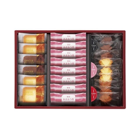 福岡名産あまおうを使用した、ほどよい甘さの「博多あまおう苺サンド」に、サクッとした食感のクッキーにホワイトクリーム・チョコレートクリームをサンドした「ラングドシャ」、プレーン・ココア・コーヒー3種類の味が楽しめる可愛らしい「絞りクッキー」の詰合せ。