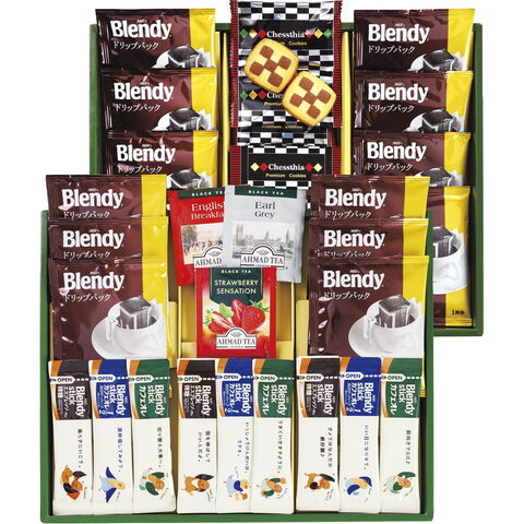 【数量・内容】チェスティアクッキー×12・AGFブレンディコーヒー(ドリップ式)7g×14・紅茶(アールグレイ・ブレックファースト・ストロベリー)各2g・AGFブレンディスティック(エスプレッソオレ6.2g・カフェオレカロリーハーフ5.4g・カフェオレ8.8g)各3 【卵・乳成分・小麦】