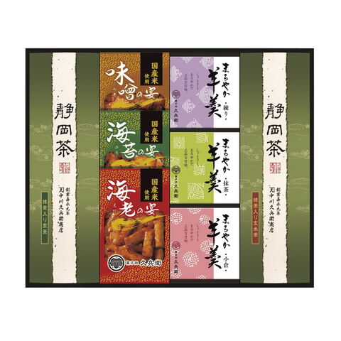 【数量・内容】抹茶入り煎茶80g・抹茶入り玄米茶80g・あられ(海老・海苔・味噌)各12g・羊かん(抹茶・練り・小倉)各60g 【小麦・えび】
