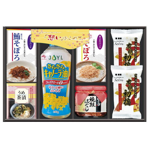 【数量・内容】焼鮭ほぐし60g・(鯛そぼろ・鮪そぼろ)7g×各2袋・梅茶漬け4.3g×2袋・有明産初摘み味のり(8切4枚)×2・Jオイルキャノーラ油350g 【小麦・えび・かに】 2セット