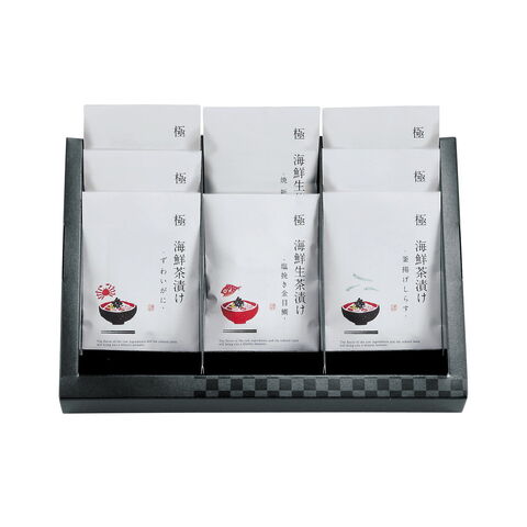 【数量・内容】【生】海鮮茶漬け(極・根昆布だし)わかめ・白ゴマ・きざみ海苔付き(塩挽き国産金目鯛×1・北海道産 焼き新巻鮭×1)、海鮮茶漬け(昆布だし)(かに×1・帆立×1・明太子×1・釜揚げしらす×2)、昆布だし梅茶漬け(特選 紀州南高梅×1) 【小麦・かに】 2セット